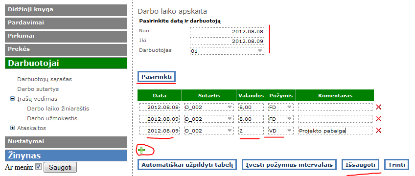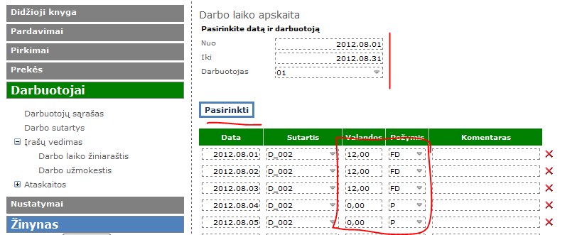Tada pasirenkamas tas mėnuo „Nuo“, „Iki“, bei atitinkamas darbuotojas, spaudžiama „Pasirinkti“ ir pildomos iš eilės valandos. Jei tą dieną dirbo: valandų skaičius, ir požymis „FD- faktiškai dirbta valandų“, jei buvo išeiginė: valandų 0, o „Požymis“ – Poilsio dienos.