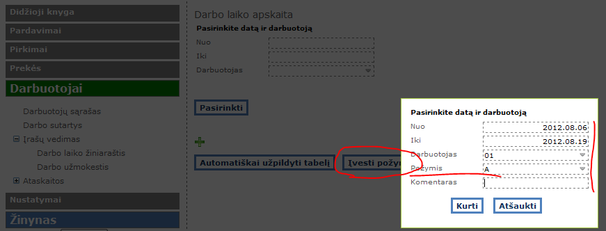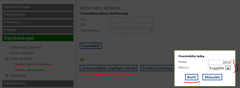 Paspaudus „Kurti“, bus sukurtas žiniaraštis pagal darbuotojų kortelėse nurodytas valandas. Jei nebuvo jokių nukrypimų nuo įprasto darbo rėžimo, tai šiuo žingsniu ir baigiamas pildyti žiniaraštis. Kitu atveju daroma taip: