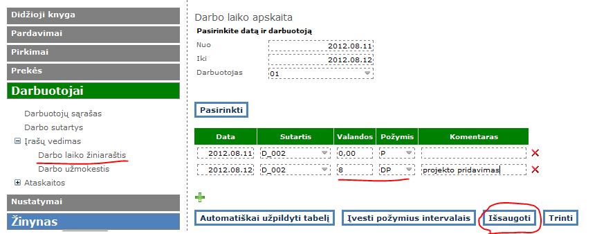 Pasirenkate datą, kada dirbo poilsio, ar švenčių dieną. Pliuso nebespaudžiate, nes pakeičiate duomenis, o ne papildote. Tiesiog vietoj 0val., įrašote tiek, kiek dirbo (pvz. 8), o „Požymis“ nurodote DP – Darbas poilsio ir švenčių dienomis“. Spaudžiate „Išsaugoti“.