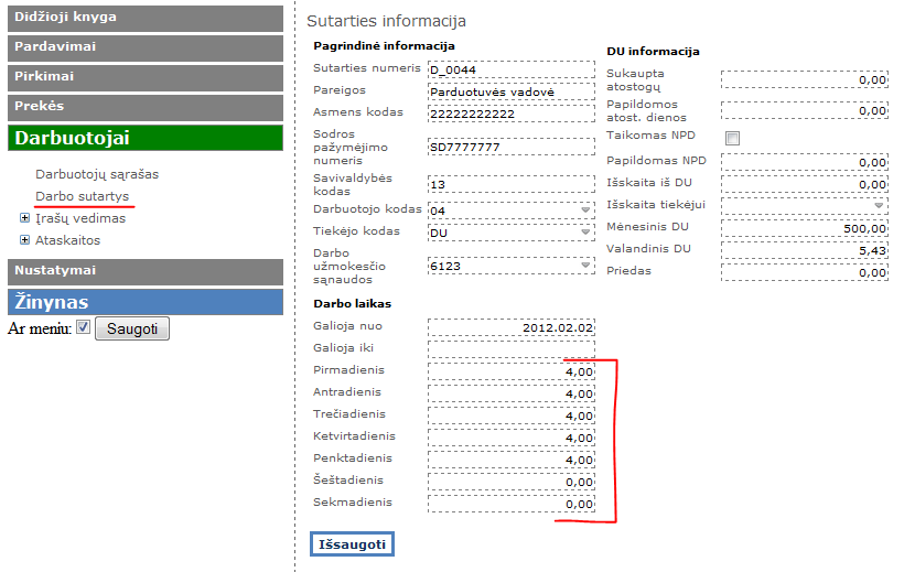 Sutarties informacijos formoje reikia užpildyti nuo pirm. iki penkt. 8val., taip nurodant, kad žmogus dirba visu etatu. Pagal šias valandas bus apskaičiuojami atostoginiai, ligos pašalpa, viršvalandžiai ir pan. Tačiau pildant konkretaus mėnesio darbo valandas, teks kiekvienai dienai įvesti valandas rankiniu būdu.